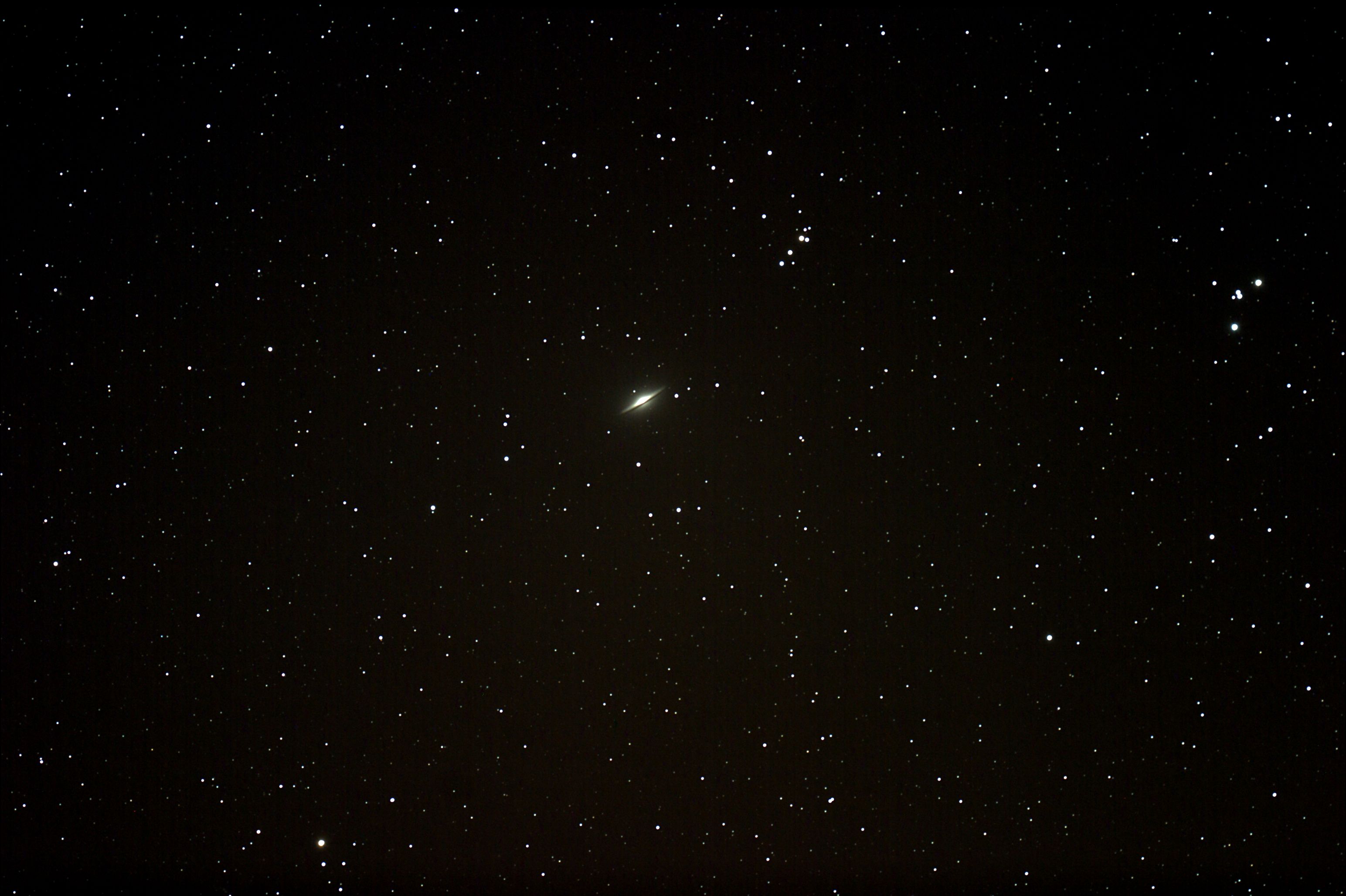 Dans la nuit de samedi (côté Ouest), Pierre a pris cette photo nous montrant, parmi d'autres objets célestes, l'étoile Sirius (en bordure à gauche), les constellations d'Orion et du Taureau puis l'amas des pléiades (vers le droite).